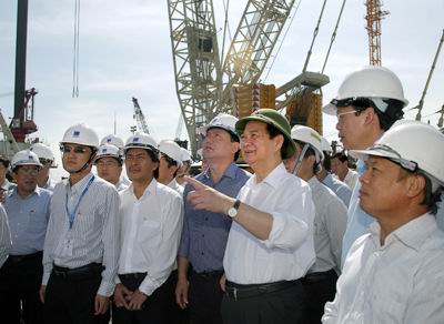 PM Nguyễn Tấn Dũng visits the construction site of the first 90m jack-up drilling rig of Việt Nam in the southern province of Bà Rịa-Vũng Tàu, July 15, 2011 – Photo: VGP/Nhật Bắc |