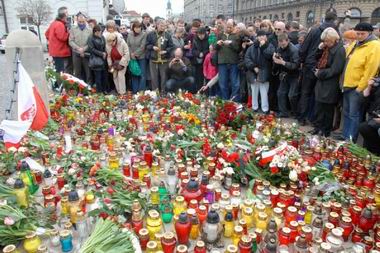 people burn candles in commemoration of President Kaczynski in front of the