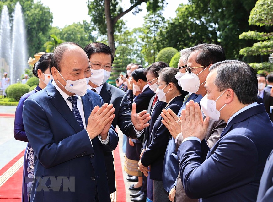 Vietnamese State President Nguyen Xuan Phuc and General Secretary of the Lao People's Revolutionary Party Central Committee and President of Laos Thongloun Sisoulith at Presidential Palace. |