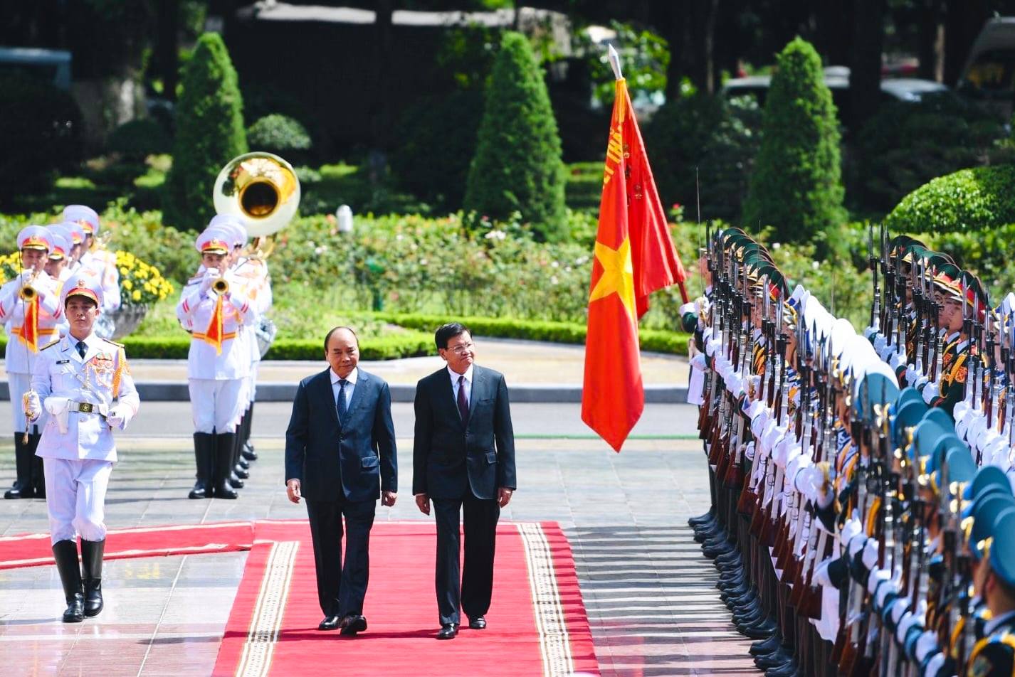 Vietnamese State President Nguyen Xuan Phuc and General Secretary of the Lao People's Revolutionary Party Central Committee and President of Laos Thongloun Sisoulith inspect the Guard of Honor at the Presidential Palace. |